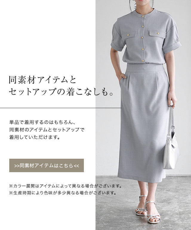 ゴールドボタンとフラップデザインが可愛いブラウス。ボリューム袖が女性らしい印象に導いてくれて、気になる二の腕もカバーしてくれます。同素材のパンツやスカートと合わせてセットアップとしてもお召しいただけます。