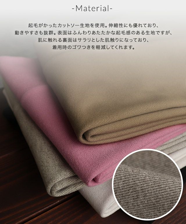 表面が起毛がかった素材で見た目にも温かみがあり、レーヨン混なので滑らかな肌触りが魅力的な一枚。