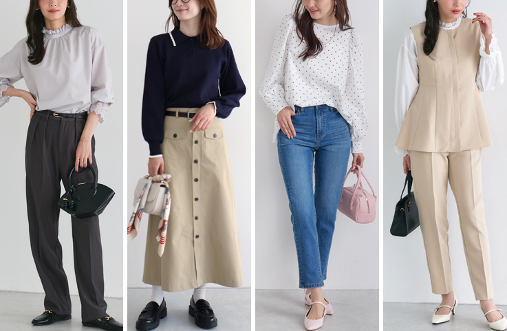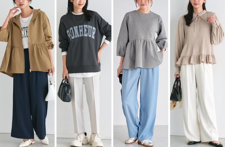 腰の位置が低めの下重心なのでウエスト位置が重要。胴長に見えやすいためハイウエストがスタイルアップのコツ。