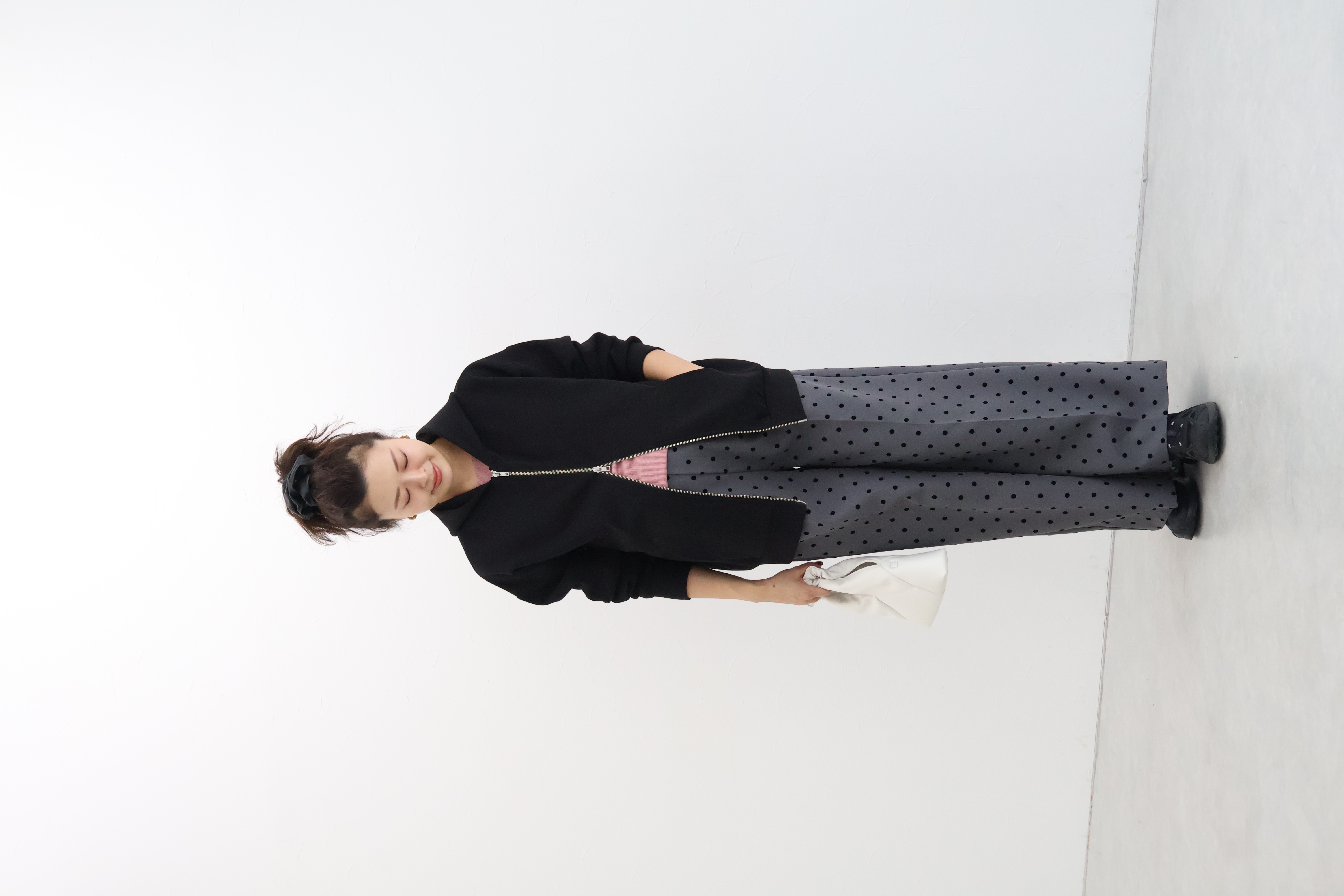 ドットが目を惹くパンツは絶妙なワイドシルエットで