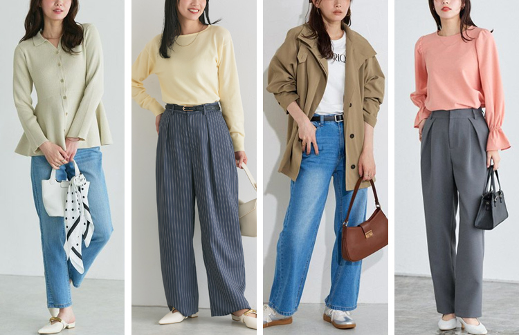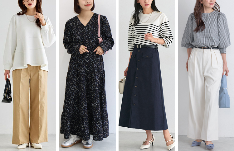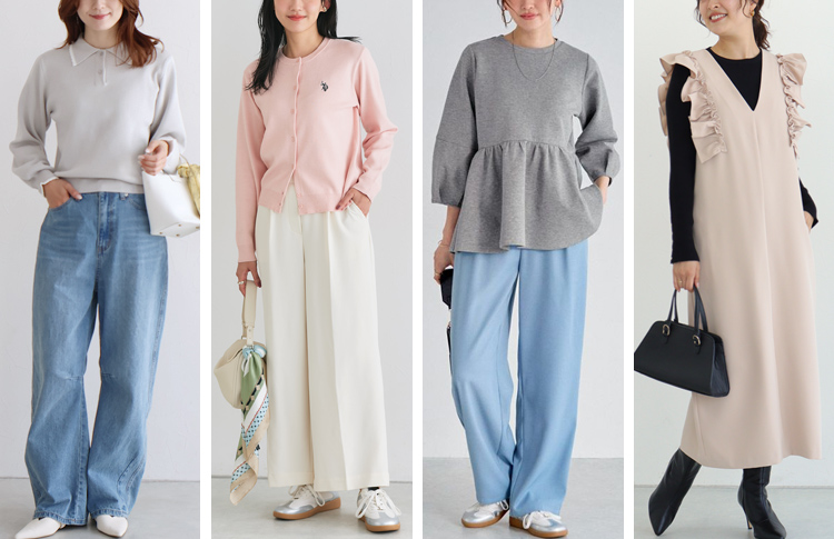 柔らかな女性らしい色が得意ですが、多用すると幼く甘い雰囲気になってしまうため紺、白、灰のベーシックカラーを中心に差し色でパステルを使うと大人上品な印象に。形で綺麗めなデザインを選ぶのもオススメです。アクセサリーはツヤ控えめシルバーまたはピンクゴールドが◎