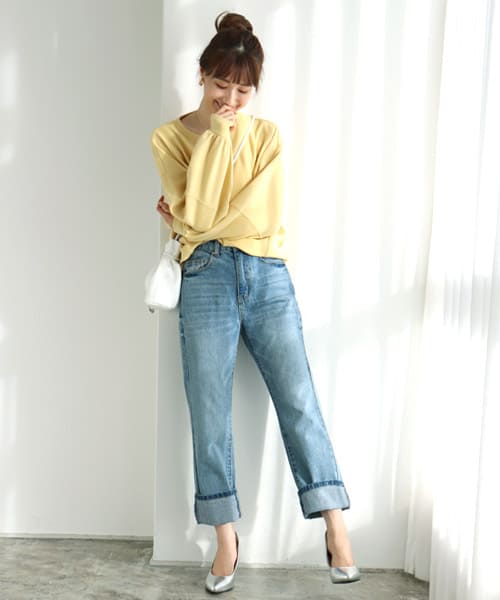 さらっと1枚で着られる季節にはラフなデニムを合わせたカジュアルスタイルを楽しんで。明るいトーンでまとめることでカラーを生かした春スタイルに仕上がります!
