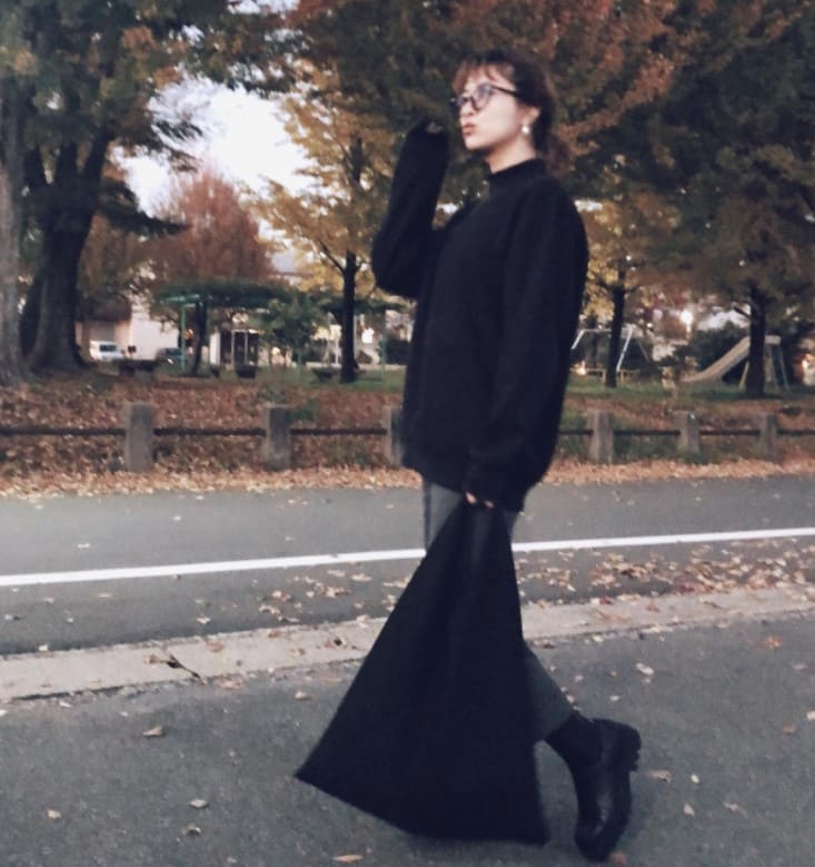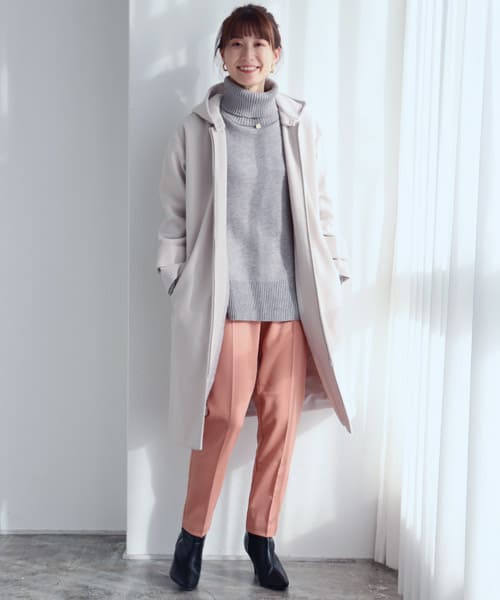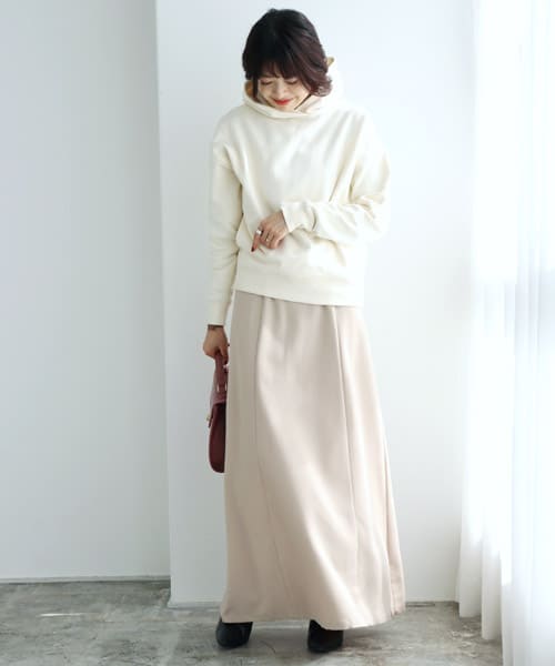 寒さの続く時期には思い切ってプルパーカーを合わせてスカート風の着こなしに◎色味をまとめることで上下につながりが出来、スタイルアップ効果にも!