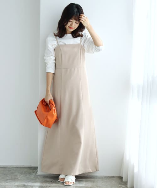 暖かくなったらインナーを合わせてキャミワンピとしての着こなしに!着こなしがシンプルな分バッグには差し色にオレンジを合わせてトレンド感をプラスして。