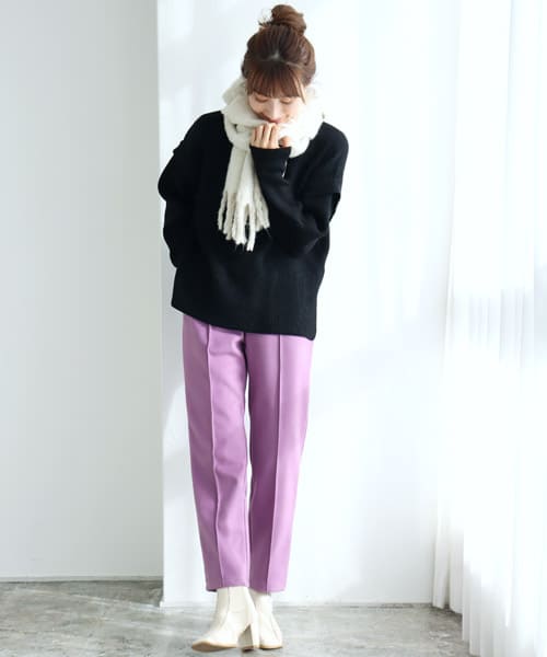 まだまだ寒いこの時期はニットトップスとして、カラーパンツを合わせた着こなしに。足元はホワイト系のブーツを合わせて垢ぬけコーデに!