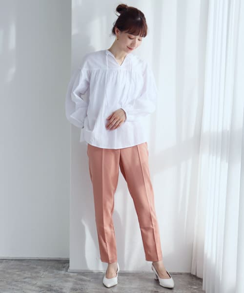 春本番のスタイリングはカラーを生かしたシンプルスタイルが◎白ブラウスに合わせるだけでカラーが引き立つ大人のシンプルコーデに!