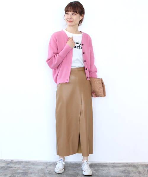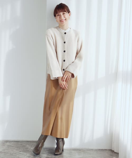 ボリューム感のあるカーデを合わせて温かみのあるスタイリングに。レザーの素材感がスタイリングにエッジを利かせてくれます。