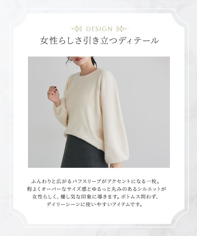 他の画像を見る #SALE 販売期間 2025/12/02 17:00 〜 \WINTER SALE!10%OFF/ ふんわりシャギーパフスリーブニット ¥ 3,990 税込 ¥ 3,591 税込 お気に入りに登録する